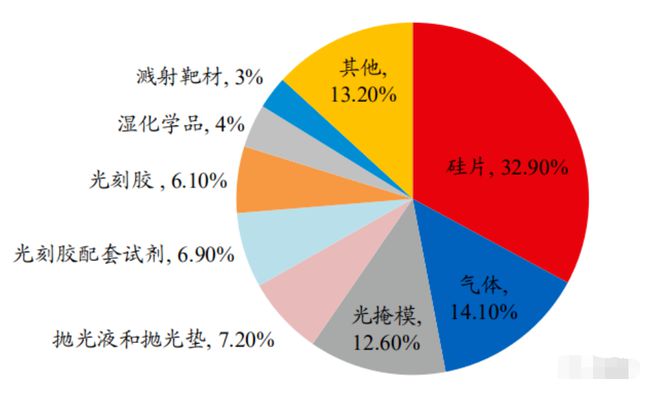 半导体材料广泛应用于晶圆的制造和包装,包括晶圆(硅片)、光罩(光掩模板)、光刻胶及辅料、化学试剂、电子气体、靶材、CMP硅片是半导体材料领域最大的类别,市场份额占32.9%,其次是气体,约占14%.1%,光掩模占12%.6%。